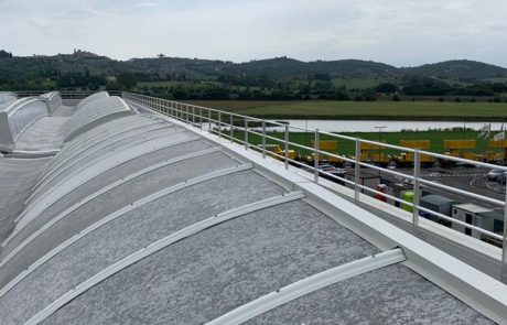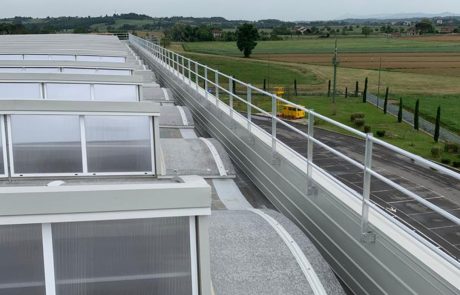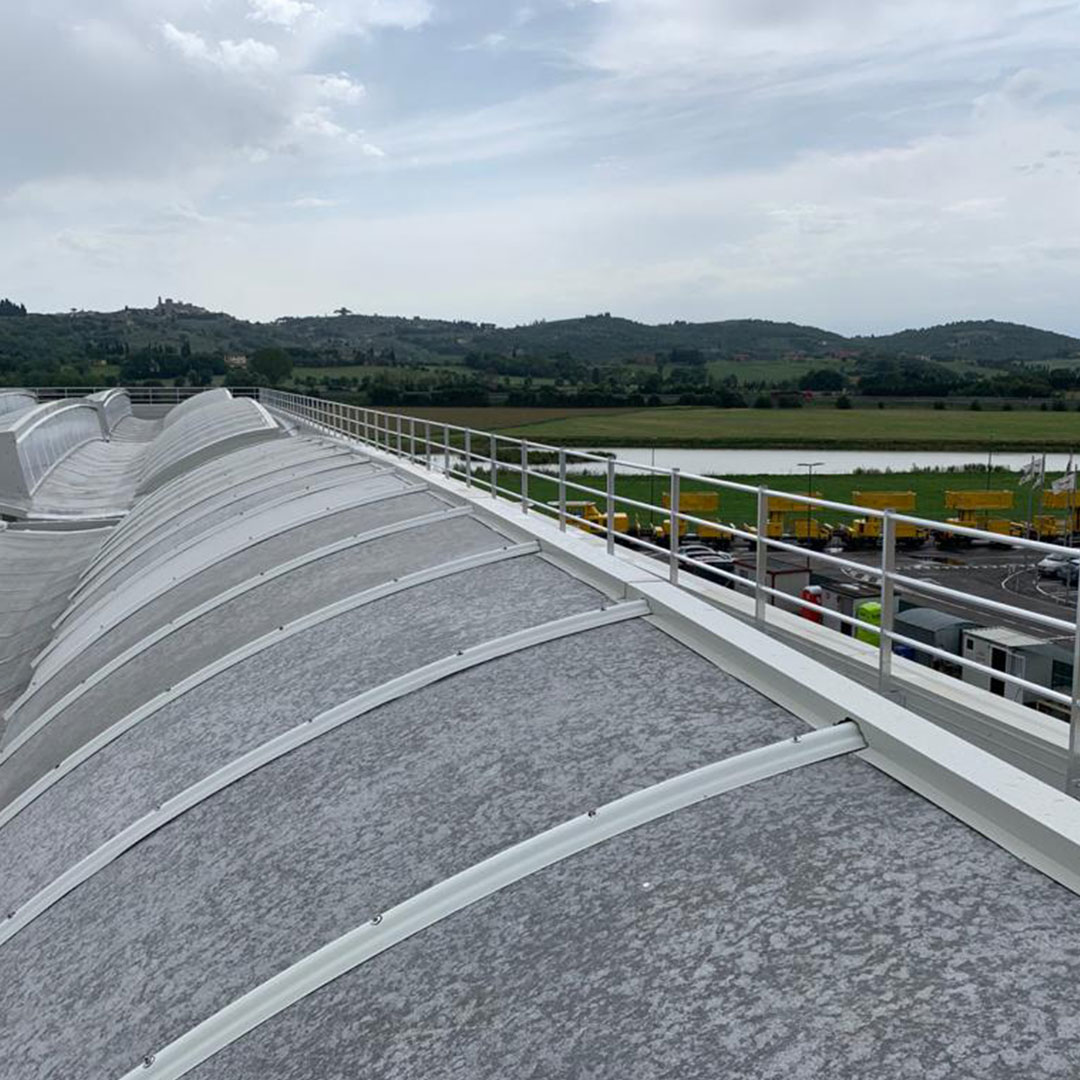 Parapetti permanenti con 3 correnti con montante a misura ed interasse massimo di posa tra due montanti consecutivi non superiore a 1,50 m. Possono essere installati esternamente o internamente alla struttura.