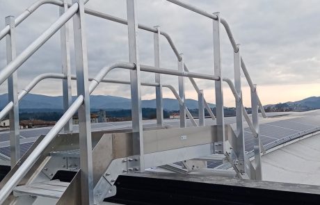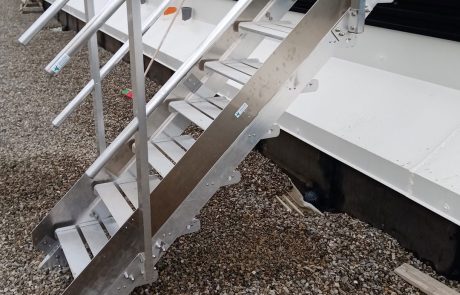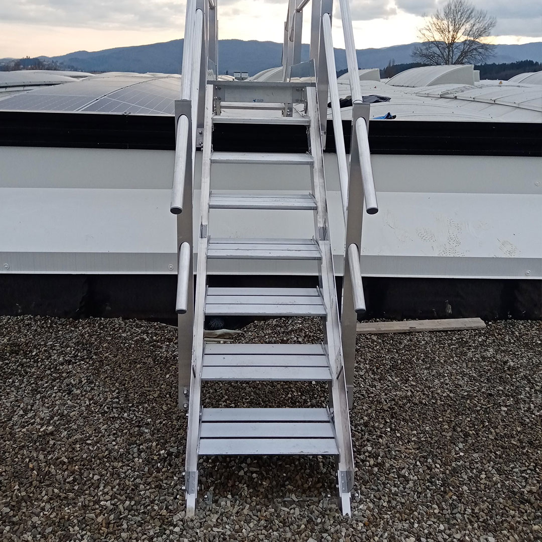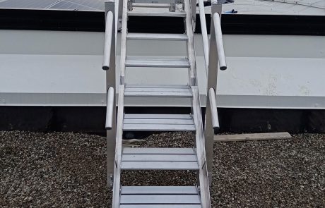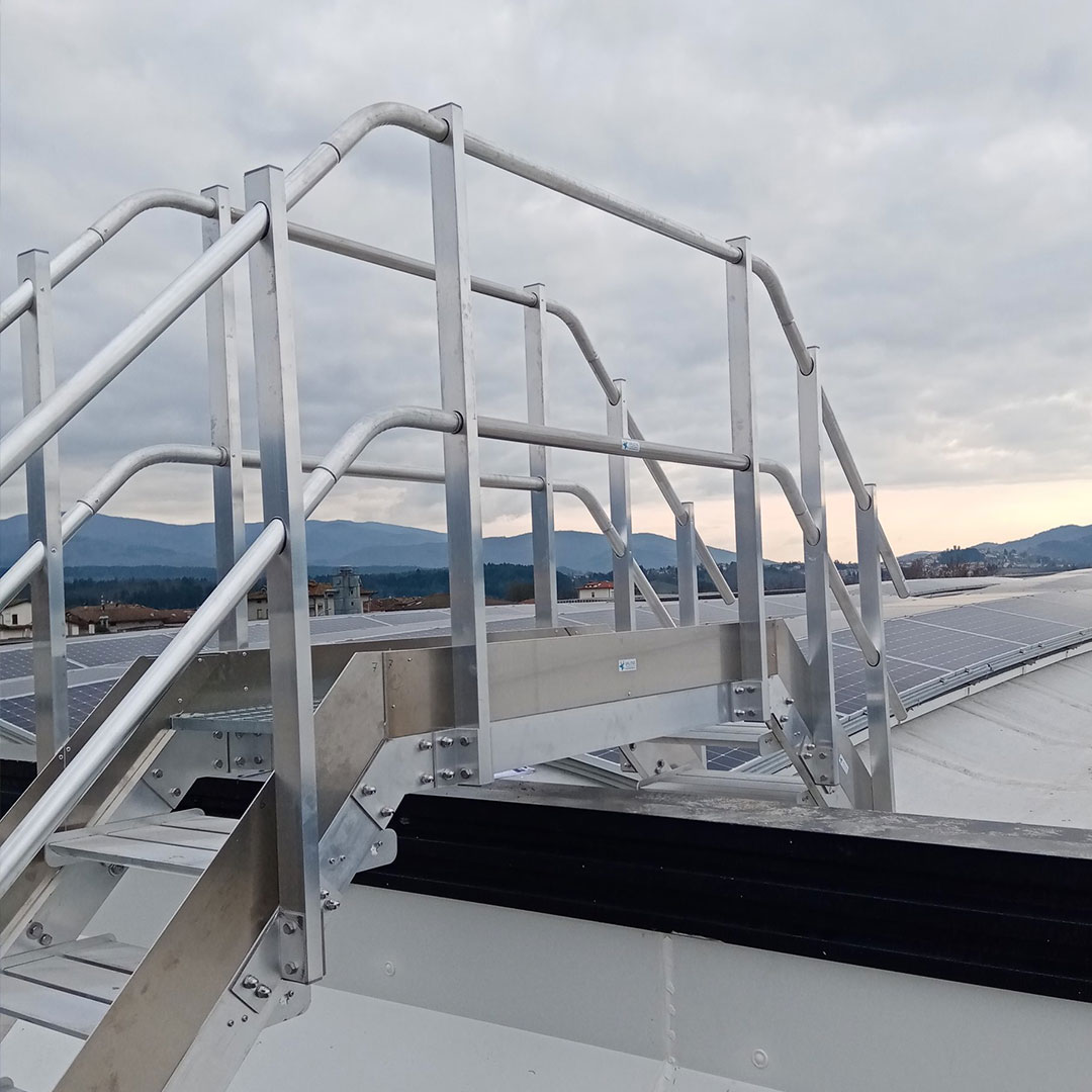 Scala a gradini per superamento ostacoli, composta da passerella con piano di alluminio in lamiera bugnata, scaletta di discesa e parapetti con lunghezza di posa tra due montanti pari a 1,50 m. Possibilità di stabilizzare la scala tramite piastre bullonate fissate alla struttura.