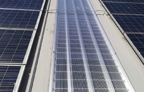 Struttura realizzata completamente in alluminio ed assemblata meccanicamente senza saldature, posata sotto al lucernario, che lo rende PEDONABILE e resistente al carico della neve. Può essere installato anche su lucernari già esistenti.