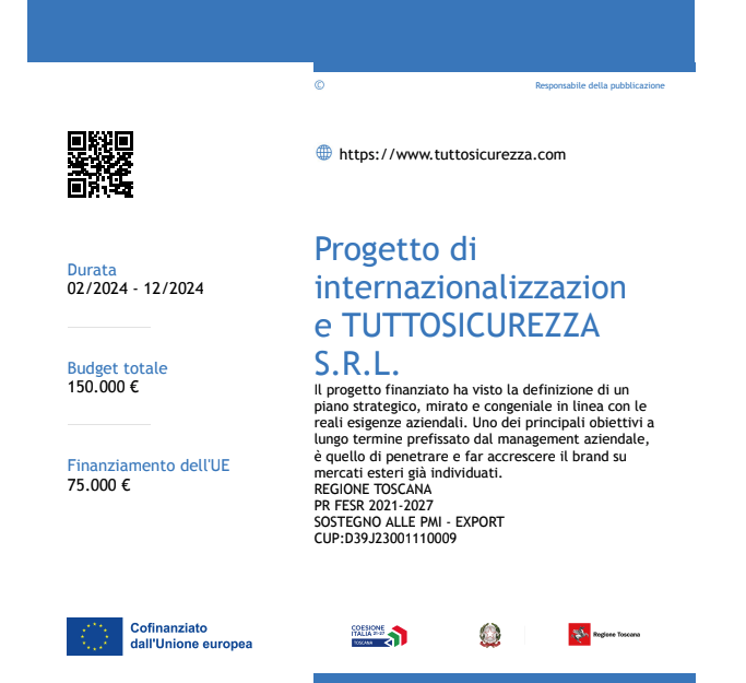 Nel 2024, Tuttosicurezza S.r.l. ha compiuto un importante passo verso l’espansione internazionale, grazie al supporto del programma PR FESR 2021-2027 della Regione Toscana. Il progetto, con un budget complessivo di 150.000 euro, di cui 75.000 euro cofinanziati dall’Unione Europea, ha consentito all’azienda di realizzare un piano strategico mirato per rafforzare la propria presenza sui mercati esteri.Bando internazionalizzazione
