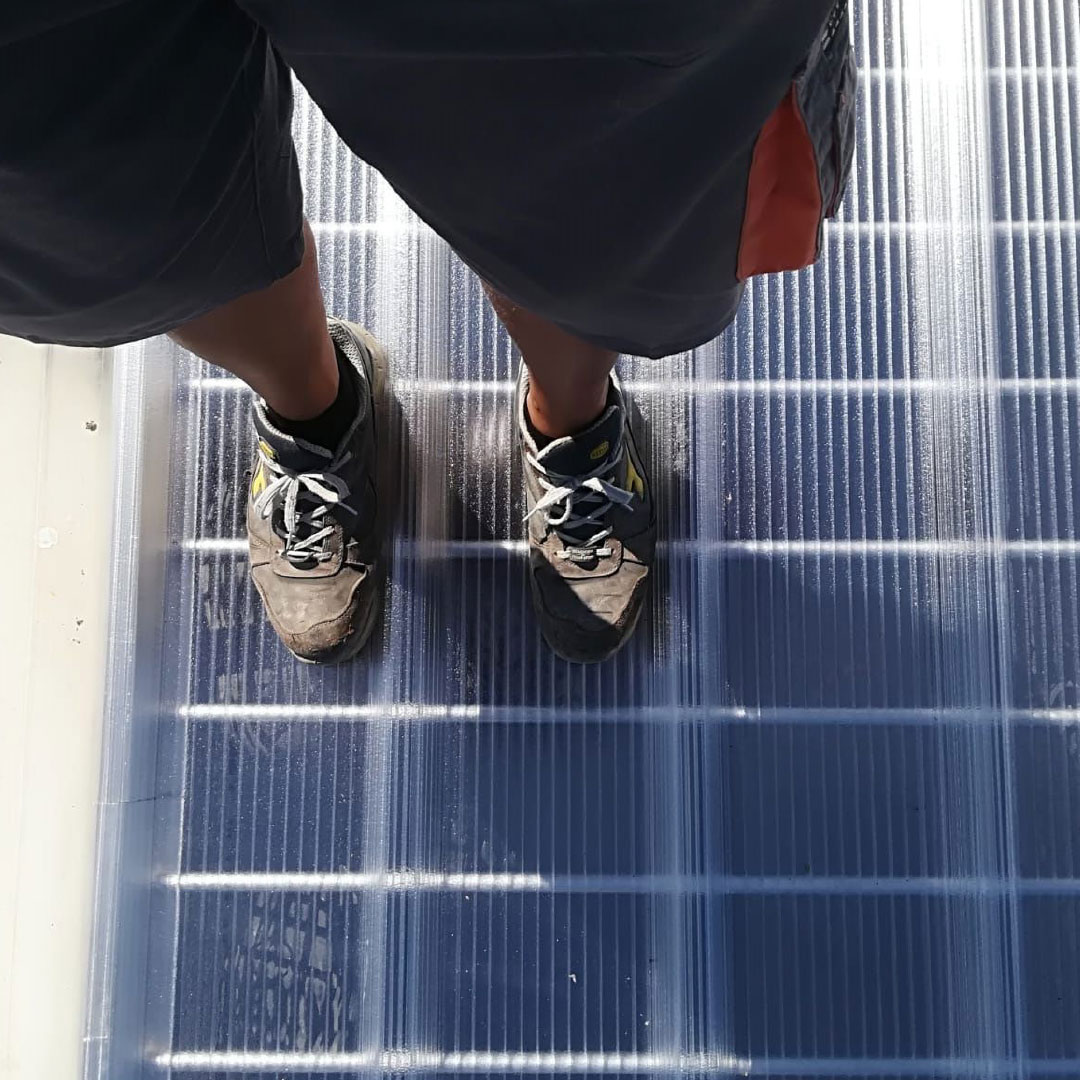 Struttura realizzata completamente in alluminio ed assemblata meccanicamente senza saldature, posata sotto al lucernario, che lo rende PEDONABILE e resistente al carico della neve. Può essere installato anche su lucernari già esistenti.